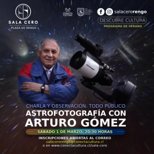 Este sábado 1 de Marzo a las 20:30 horas, acompáñanos en una experiencia única con el reconocido astrofotógrafo chileno Arturo Gómez. Durante la actividad, Gómez compartirá una charla inspiradora sobre su trabajo y su trayectoria, mostrando algunas de sus impresionantes capturas del universo. Luego, disfrutaremos de una observación guiada de las estrellas y planetas a través de un telescopio profesional.